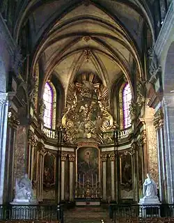 La Descente de croix est une œuvre du troisième quart du XVIIIe siècle réalisée par le peintre Charles-Joseph Natoire[10],[11]. Cette peinture est fortement inspirée de la toile intitulée L'Élévation de la croix de Rubens conservée au cœur de la cathédrale Notre-Dame d'Anvers[10]. Parmi les hommes positionnés sur des échelles posées sur la croix ou au pied de cette dernière pour y décrocher le corps du Christ, on aperçoit Nicodème en haut à gauche, ainsi que Jean vêtu en rouge, soutenant le corps du défunt. On reconnaît au premier plan Marie-Madeleine grâce à sa longue chevelure rousse, et la Vierge installée dans la pénombre au pied de la croix, les mains jointes de douleur[10]. L'accent est mis sur la grande arabesque du linceul, le long duquel descend la dépouille du Christ, en accord avec le vocable de l'abside[10]. Simon de Cyrène tient le bout de ce linceul, coiffé d'un turban. Pierre Rosenberg a découvert un dessin préparatoire ainsi qu'une esquisse peinte de l'œuvre lors d'une vente, qui font à présent partie d'une collection particulière[10]. Cette toile est classée monument historique depuis 1992[11].