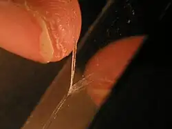 Premièrement, on observe que l'énergie dissipée au cours du test dépend de l'angle de pelage. Sur les images et animations ci-contre, on voit une expérience de pelage à petit angle. L'animation montre l'apparition de bulles proches du front de pelage. Sur l'image, prise à plus grande distance, on observe l'apparition de fibrilles en aval du front de pelage.