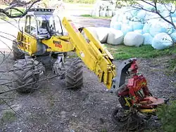 La pelle araignée est également disponible en version à quatre roues afin que la machine puisse être déplacée plus facilement. La version la plus avancée a quatre roues de taille égale et une transmission intégrale (4 RM). Certaines machines sont conçues pour être héliportées ou treuillées facilement.