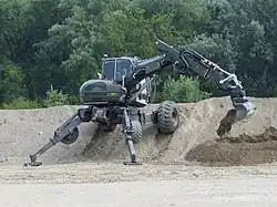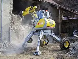 Pour avancer, le conducteur étend la flèche et l'appuie contre le sol pour que les jambes avant se soulèvent. En rentrant la flèche, l'ensemble de la machine roule sur les roues arrière (éventuellement aidé par leur transmission) vers la flèche. En levant la flèche, le conducteur redescend les jambes avant et ainsi de suite. L'engin recule en poussant sur la flèche. On peut tourner en faisant pivoter l'engin après le levage (méthode aussi utilisée sur les pelles à chenilles). La pelle peut travailler sur des pentes allant jusqu'à 45 degrés ou escalader des marches de plusieurs mètres[3].