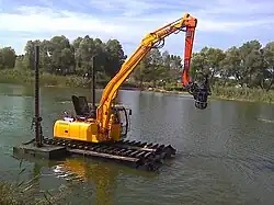 La pelle amphibie (parfois pelle marais) est assez similaire à la pelle à chenilles : les supports de chenilles sont remplacés par d'énormes caissons étanches (ou pontons), éventuellement en aluminium, permettant à la machine de flotter. Les chenilles classiques sont remplacées par un jeu de chaînes à barrettes, parfois en élastomère plus léger qui glisse sur les pontons et permet à la machine d'évoluer sur la terre ferme ou les marécages[5]. En eaux peu profondes (1 à 4 m), la machine peut être stabilisée par des béquilles longues appelées piliers d'ancrage. En eaux profondes, les pontons sont doublés et la machine doit être mue par une hélice ; elle reçoit généralement un équipement longue portée. Elle peut entraîner une pompe afin de préparer les travaux dans les marais ou les mines et peut être d'une aide précieuse lors d'inondation catastrophique[6].