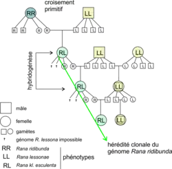 La différence avec un hybride mendélien se situe au moment de la reproduction : il se produit une élimination systématique du génome d'un de ses parents et la seule transmission du génome de l'autre parent, en général le génome ridibundus. Sur la figure 1, on voit que les gamètes L (marqués par une croix) de l'hybride RL sont désavantagés par rapport aux gamètes R. La perpétuation de la lignée hybride se fait par rétrocroisement avec l'espèce parentale dont le génome L a été éliminé afin de le réintroduire lors de la gamétogenèse.
