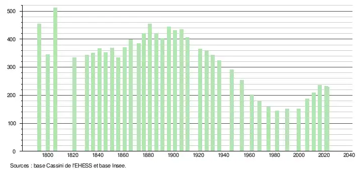 L'évolution du nombre d'habitants est connue à travers les recensements de la population effectués dans la commune depuis 1793. Pour les communes de moins de 10 000 habitants, une enquête de recensement portant sur toute la population est réalisée tous les cinq ans, les populations de référence des années intermédiaires étant quant à elles estimées par interpolation ou extrapolation[24]. Pour la commune, le premier recensement exhaustif entrant dans le cadre du nouveau dispositif a été réalisé en 2006[25].