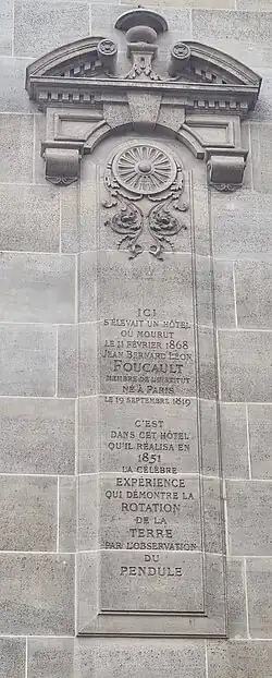 La première expérience a lieu le dans la cave de sa maison située au carrefour des rues d'Assas et de Vaugirard (Paris)[2],[3]. Avec l'aide de François Arago, l'expérience sera renouvelée le 3 février 1851 à l'Observatoire de Paris (l'invitation précisait "Vous êtes invités à venir voir la Terre tourner dans la salle méridienne de l'Observatoire de Paris"). La première démonstration publique date de quelques mois plus tard, toujours en 1851, le pendule étant accroché à la voûte du Panthéon de Paris. L'intérêt du pendule, imaginé et réalisé par Foucault, est de mettre en évidence la rotation de la Terre, manifestée par la déviation constante du plan d'oscillation du pendule.