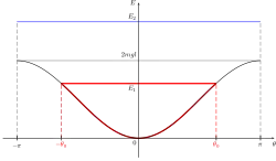 Si on trace en fonction de θ le graphe de l'énergie potentielle mgl(1 − cos θ), on obtient la figure suivante. On a tracé en gris le niveau de l'énergie potentielle maximale 2mgl.