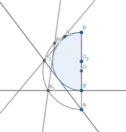 La suite polygonale des doit être circonscrite à un cercle de centre (compris entre et ), tangent en à et . De même, la suite : cercle de centre . Compléter l'arbelos. Les segments radiaux, issus des , découpent l'arbelos en quadrangles curvilignes ; les griser en deux valeurs de gris : la figure donne une idée de la dynamique du pendule qui « s'essouffle en montant ».