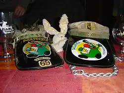 Des lettres de cuivre représentant les initiales du nom du cercle et/ou du cercle régional sont fixées sur les tempes.