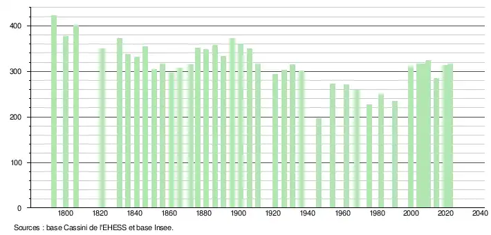 L'évolution du nombre d'habitants est connue à travers les recensements de la population effectués dans la commune depuis 1793. Pour les communes de moins de 10 000 habitants, une enquête de recensement portant sur toute la population est réalisée tous les cinq ans, les populations de référence des années intermédiaires étant quant à elles estimées par interpolation ou extrapolation[32]. Pour la commune, le premier recensement exhaustif entrant dans le cadre du nouveau dispositif a été réalisé en 2004[33].