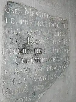 - ↑ Les révolutionnaires violent la sépulture, brisent la dalle tumulaire, enlèvent le plomb du cercueil (pour en faire des balles, prétend-on) et rejettent les ossements pêle-mêle dans la terre. Ces restes sont exhumés et transférés en 1835, à l'école normale, rue Saint-Lô. Ils y resteront jusqu'en 1880, date de leur transfert au pensionnat.