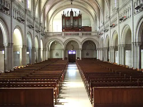 La chaire et les bancs des élèves sont en bois de chêne, les lampadaires en bronze, les grilles en fer forgé, le tout dans le même style. Les vitraux du chœur rappellent les scènes principales de la vie de Notre-Seigneur; et dans les bas-côtés, des médaillons dans un cadre de grisailles représentent les douze Apôtres dans leur martyre ou travaux de prédication. »