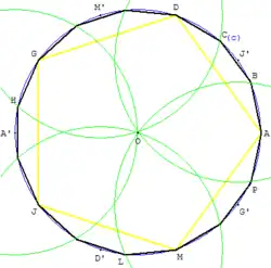 Les points du pentadécagone sont les points d'intersection du cercle (c) avec les cercles de centres A', D', G', J', M' passant par le centre O.
