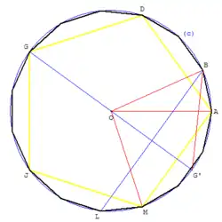 Sur un cercle, à partir d'un point A, on place un point G tel que ; le point B tel que est le deuxième sommet du polygone régulier de côté AB.