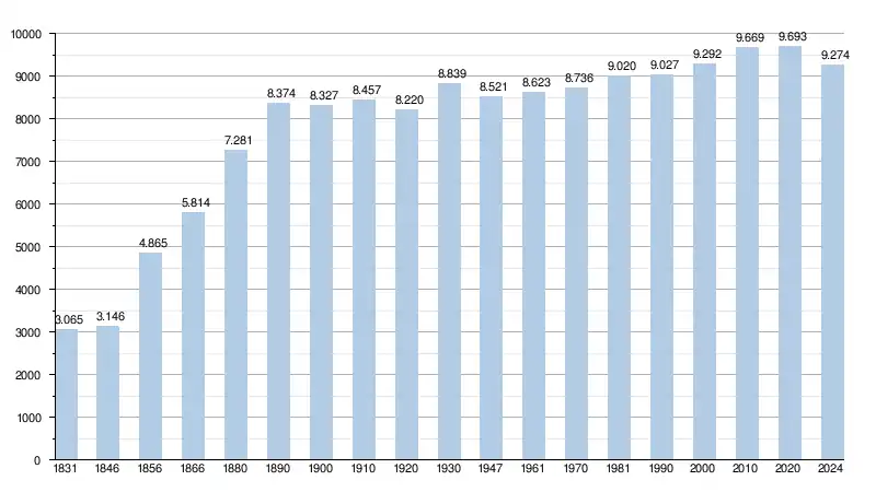 Les chiffres des années 1831 à 1970 tiennent compte des chiffres des anciennes communes fusionnées.