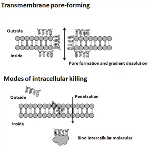 Les modes d'action par lesquels les peptides antimicrobiens tuent les microbes varient [9] et peuvent différer d'une espèce bactérienne à l'autre[10]. Certains peptides antimicrobiens tuent à la fois les bactéries et les champignons, par exemple le psoriasin tue E. coli et plusieurs champignons filamenteux[11]. La membrane cytoplasmique est une cible fréquente, mais les peptides peuvent également interférer avec la synthèse de l'ADN et des protéines, le repliement des protéines et la synthèse de la paroi cellulaire[9]. Le contact initial entre le peptide et l'organisme cible est électrostatique, car la plupart des surfaces bactériennes sont anioniques ou hydrophobes, comme dans le peptide antimicrobien Piscidin. Leur composition en acides aminés, leur caractère amphipathique, leur charge cationique et leur taille leur permettent de s’attacher aux bicouches membranaires et de s’insérer dans celles-ci pour former des pores par des mécanismes à barreaux, à tapis ou à pores toroïdaux. Alternativement, ils peuvent pénétrer dans la cellule pour lier des molécules intracellulaires qui sont essentielles à la vie cellulaire[12]. Les modèles de liaison intracellulaire comprennent l'inhibition de la synthèse de la paroi cellulaire, l'altération de la membrane cytoplasmique, l'activation de l'autolysine, l'inhibition de la synthèse de l'ADN, de l'ARN et des protéines et l'inhibition de certaines enzymes. Cependant, dans de nombreux cas, le mécanisme exact de la mise à mort n'est pas connu. Une technique émergente pour l'étude de tels mécanismes est l' interférométrie à double polarisation[13],[14]. Contrairement à de nombreux antibiotiques classiques, ces peptides semblent être bactéricides[1] au lieu de bactériostatiques. En général, l'activité antimicrobienne de ces peptides est déterminée en mesurant la concentration minimale inhibitrice (CMI), qui est la plus faible concentration de médicament inhibant la croissance bactérienne[15].