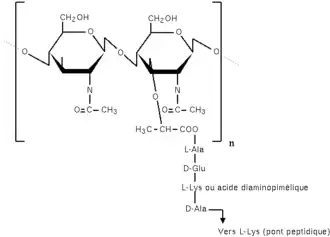 Il est constitué d'une partie glucidique (polysaccharide) et d'une partie peptidique. Le polysaccharide est un polymère de glycosaminopeptide où la N-acétyl-glucosamine (NAG) et l'acide N-acétyl-muramique (NAM) sont liés par des liaisons osidiques . Cette liaison peut être coupée par le lysozyme. Le NAM est un composé spécifique des parois bactériennes. Deux polysaccharides sont liés par des ponts peptidiques au niveau du NAM, formés par différents acides aminés : D-alanine, L-alanine, acide glutamique, L-lysine, acide diaminopimélique (analogue de la lysine). Les acides aminés D sont spécifiques de la paroi bactérienne, on ne les retrouve jamais ailleurs.