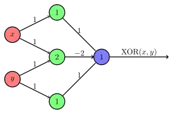 La figure à droite montre un perceptron multi-couche qui calcule le OU exclusif (XOR). C'est un réseau à trois couches. La couche d'entrée possède deux neurones : et . La couche cachée possède 3 neurones. La dernière couche est la couche de sortie et possède un neurone de sortie.
