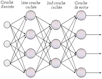 En intelligence artificielle, plus précisément en apprentissage automatique, le perceptron multicouche (multilayer perceptron MLP en anglais) est un type de réseau neuronal artificiel organisé en plusieurs couches. Un perceptron multicouche possède au moins trois couches : une couche d'entrée, au moins une couche cachée, et une couche de sortie. Chaque couche est constituée d'un nombre (potentiellement différent) de neurones. L'information circule de la couche d'entrée vers la couche de sortie uniquement : il s'agit donc d'un réseau à propagation directe (feedforward). Les neurones de la dernière couche sont les sorties du système global.