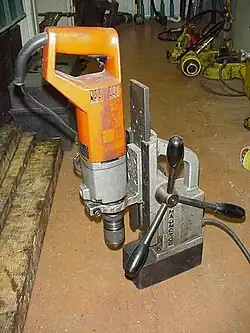 C'est une machine-outil composée d'un corps de perceuse traditionnelle montée par l'intermédiaire d'un axe vertical sur une embase magnétique (un électroaimant) qui permet de fixer cette dernière sur les pièces en fer que l'on doit percer. Elle s'utilise principalement en charpente métallique. Cette perceuse peut travailler avec des forets traditionnels équipée d'un adaptateur et d'un mandrin. Mais elle est prévue d'origine pour fonctionner avec des trépan. Du fait de leur conception qui diffère de celle des fraiseuses, les perceuses (dépourvues de cône et de broche) ne permettent pas l'usage de fraises (outils capables de travailler latéralement, et parfois en plongée). Cette perceuse doit toujours être utilisée avec une chaîne de sécurité afin d'éviter les chutes en cas de coupure de courant.