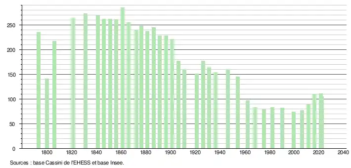 L'évolution du nombre d'habitants est connue à travers les recensements de la population effectués dans la commune depuis 1793. Pour les communes de moins de 10 000 habitants, une enquête de recensement portant sur toute la population est réalisée tous les cinq ans, les populations de référence des années intermédiaires étant quant à elles estimées par interpolation ou extrapolation[26]. Pour la commune, le premier recensement exhaustif entrant dans le cadre du nouveau dispositif a été réalisé en 2006[27].