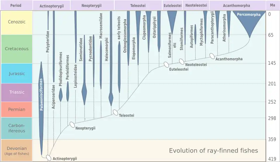 Les Percomorpha sont aujourd'hui le groupe le plus diversifié de poissons téléostéens. Les téléostéens, et les percomorpha en particulier, ont prospéré pendant l'ère Cénozoïque. Les preuves fossiles montrent qu'il y a eu une augmentation majeure de la taille et de l'abondance des Percomorpha immédiatement après l'extinction Crétacé-Paléogène, il y a 66 Ma[6].