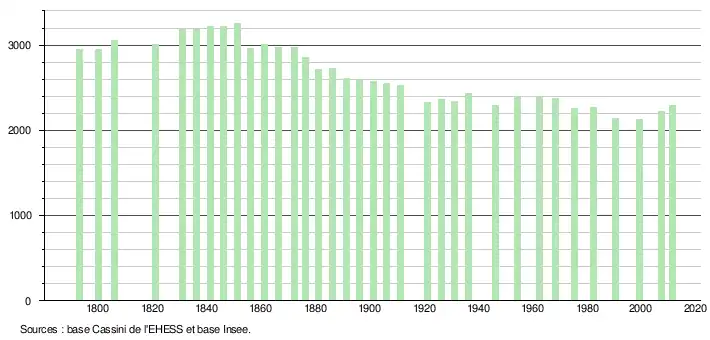 - ↑ Dans le tableau des recensements et le graphique, par convention dans Wikipédia, le principe a été retenu, pour les populations légales postérieures à 1999 de n’afficher dans le tableau des recensements et le graphique que les populations correspondant à l'année 2006, première population légale publiée calculée conformément aux concepts définis dans le décret no 2003-485 du 5 juin 2003, et les années correspondant à une enquête exhaustive de recensement pour les communes de moins de 10 000 habitants, ainsi que la dernière population légale publiée par l’Insee.