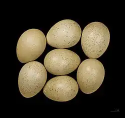 La femelle pond généralement 10 à 15 œufs d'une teinte brun jaunâtre pâle tachetés de brun-roux. L'incubation est assurée par la femelle seule pendant une période qui varie entre 24 et 25 jours. Le mâle, stationne proche du nid et assure la protection du territoire. Les petits sortent du nid peu de temps après leur naissance mais restent à proximité jusqu'à ce qu'ils soient en âge de voler[1].