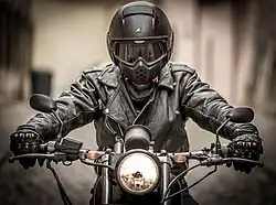 - une fermeture croisée à fermeture à glissière décalée sur le devant, doublant ainsi l'épaisseur de cuir pour mieux protéger le torse ;
