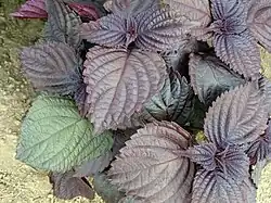 - Perilla frutescens var. crispa f. crispidicolor Makino, en japonais 縮緬片面紫蘇 (chirimen-katamen-jiso) à feuilles vertes au-dessus, violet en dessous ;