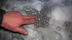 Les fontaines pétrifiantes, aériennes ou souterraines, déposent souvent des concrétions mamelonnées là où coulent ces eaux chargées de Ca2+ et d’HCO3−. Dans certains contextes agités, cela forme des sphérules, appelées perles de cavernes[2] quand on les trouve dans des grottes.
