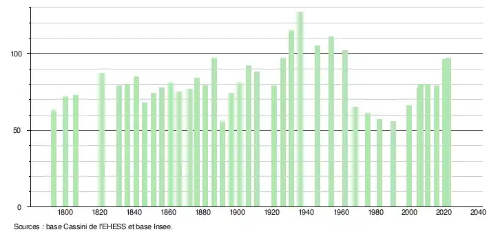 L'évolution du nombre d'habitants est connue à travers les recensements de la population effectués dans la commune depuis 1793. Pour les communes de moins de 10 000 habitants, une enquête de recensement portant sur toute la population est réalisée tous les cinq ans, les populations de référence des années intermédiaires étant quant à elles estimées par interpolation ou extrapolation[10]. Pour la commune, le premier recensement exhaustif entrant dans le cadre du nouveau dispositif a été réalisé en 2005[11].