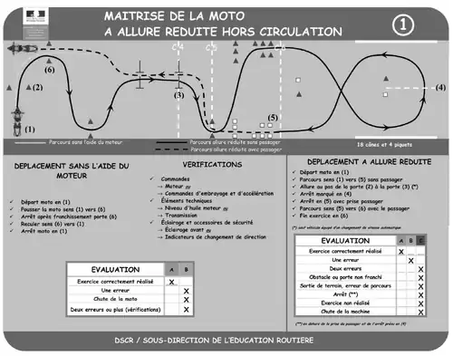 - trois manœuvres de maîtrise de la moto à allure réduite, dont une sans l'aide du moteur :