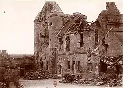Le , il est bombardé cinq heures durant comme le reste de la vallée[42],[43] et largement ruiné. Si les vestiges de la forteresse médiévale sont encore bien visibles[44],[45],[46] et paradoxalement en assez bon état général (seule la façade est, les toitures et les planchers ont été soufflés par l'explosion des obus ayant percé la construction) le logis Renaissance, très endommagé, fut finalement rasé dans les années 1930.