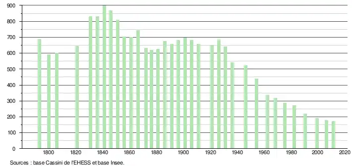L'évolution du nombre d'habitants est connue à travers les recensements de la population effectués dans la commune depuis 1793. À partir du , les populations légales des communes sont publiées annuellement dans le cadre d'un recensement qui repose désormais sur une collecte d'information annuelle, concernant successivement tous les territoires communaux au cours d'une période de cinq ans. Pour les communes de moins de 10 000 habitants, une enquête de recensement portant sur toute la population est réalisée tous les cinq ans, les populations légales des années intermédiaires étant quant à elles estimées par interpolation ou extrapolation[17]. Pour la commune, le premier recensement exhaustif entrant dans le cadre du nouveau dispositif a été réalisé en 2006[18],[Note 9].