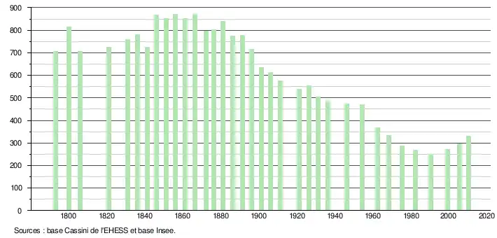 L'évolution du nombre d'habitants est connue à travers les recensements de la population effectués dans la commune depuis 1793. À partir du , les populations légales des communes sont publiées annuellement dans le cadre d'un recensement qui repose désormais sur une collecte d'information annuelle, concernant successivement tous les territoires communaux au cours d'une période de cinq ans. Pour les communes de moins de 10 000 habitants, une enquête de recensement portant sur toute la population est réalisée tous les cinq ans, les populations légales des années intermédiaires étant quant à elles estimées par interpolation ou extrapolation[13]. Pour la commune, le premier recensement exhaustif entrant dans le cadre du nouveau dispositif a été réalisé en 2005[14],[Note 6].