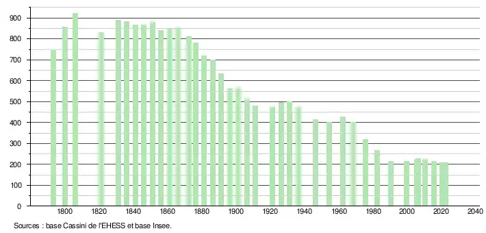 L'évolution du nombre d'habitants est connue à travers les recensements de la population effectués dans la commune depuis 1793. Pour les communes de moins de 10 000 habitants, une enquête de recensement portant sur toute la population est réalisée tous les cinq ans, les populations de référence des années intermédiaires étant quant à elles estimées par interpolation ou extrapolation[32]. Pour la commune, le premier recensement exhaustif entrant dans le cadre du nouveau dispositif a été réalisé en 2005[33].