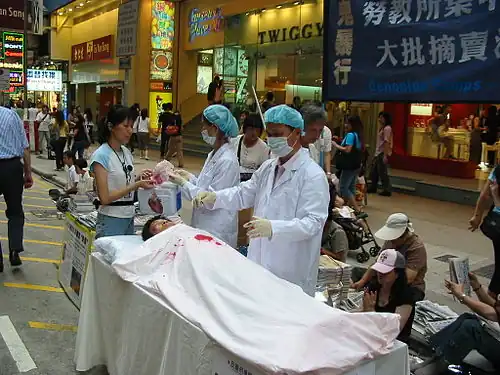 Deux Canadiens, l'avocat David Matas et le politicien David Kilgour, accusent Pékin de prélever les organes des membres du Falun Gong contre leur volonté. Ils estiment qu'il y a eu 41 500 transplantations d'organes non expliquées entre 2000 et 2005[126].