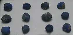 La grande palette des couleurs retrouvées donne en effet une idée de la richesse polychromique présente à l’origine : noir (asphalte), rouge (verre rouge opaque, vermillon, hématite de l’ocre rouge), vert, bleu égyptien, blanc, jaune (ocre ou doré). L’utilisation de pigments végétaux est évoquée, mais n’est pas à ce jour démontrée[50].