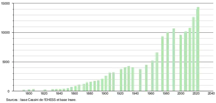 - ↑ Par convention dans Wikipédia, le principe a été retenu de n’afficher dans le tableau des recensements et le graphique, pour les populations de référence postérieures à 1999, que les populations correspondant à une enquête exhaustive de recensement pour les communes de moins de 10 000 habitants, et que les populations des années 2006, 2011, 2016, etc. pour les communes de plus de 10 000 habitants, ainsi que la dernière population de référence publiée par l’Insee pour l'ensemble des communes.