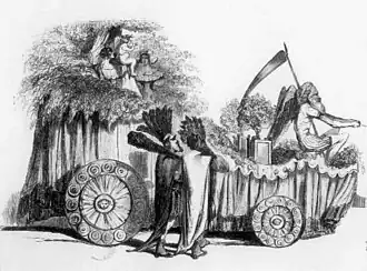 - ↑ Détail d'une gravure de Porret extraite de l'ouvrage anonyme Le Carnaval et marche burlesque du bœuf gras avec 24 dessins de MM. Seigneurgens et Achile Giroux, Gravés par Porret, Texte par un Professeur de philosophie de l'Académie d'Yvetot. Sans mention d'éditeur si ce n'est : Paris, chez tous les marchands de nouveautés.