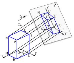 Un dessin en perspective parallèle est le résultat d'une projection sur un plan (P) selon une direction (d) quelconque. Un repère orthonormé (O, U, V, W) se projette en (o, u, v, w), définissant ainsi trois axes du plan (ou), (ov), (ow) gradués selon les longueurs ou, ov, ow. Un point M de l'espace de coordonnées (x, y, z) se projette alors dans le plan selon le point m du plan vérifiant l'égalité vectorielle