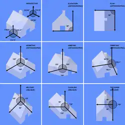 Le choix des directions des trois axes ainsi que les facteurs à opérer sur les longueurs des trois axes sont laissées au libre arbitre des dessinateurs. Parmi des pratiques très diverses, associées à un vocabulaire mal stabilisé[1], on distingue cependant certaines perspectives privilégiées.