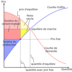 Prenons le cas d’un prix fixé en dessous de la valeur d’équilibre (voir graphique à la droite). À l'équilibre, le surplus du consommateur est la surface entre le prix d’équilibre et la courbe de demande. Le surplus du producteur est la surface entre la courbe d’offre et le prix d’équilibre. Si le prix est fixé sous la valeur d'équilibre, le surplus du consommateur est la surface orange et celui du producteur la surface bleue. En additionnant la perte et le gain éventuel de surplus, on observe qu’il reste une perte nette, par rapport au cas d'équilibre. Cette perte de bien due à la fixation du prix est appelée « perte sèche ». Elle est représentée par la surface jaune.