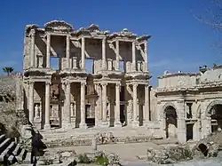 - ↑ D'après l'interprétation de Wendel et Göber 1961, renforcée en plus par le récit d'Aphthonius d'Antioche, qui l’a visitée à la fin du IVe siècle. Il a décrit les salles pleines de livres, libres d'accès à tous, et « toute la ville attirée pour intérioriser les sagesses » (Aphthonius, Progymnasmata 12).