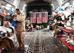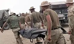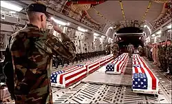 ![]() Au 19 juillet 2021, selon le site Web du ministère américain de la Défense, il y a eu 4 431 morts au total et 31 994 blessés au combat à la suite de la guerre en Irak[36]. |