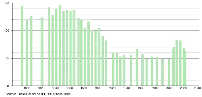 L'évolution du nombre d'habitants est connue à travers les recensements de la population effectués dans la commune depuis 1793. Pour les communes de moins de 10 000 habitants, une enquête de recensement portant sur toute la population est réalisée tous les cinq ans, les populations de référence des années intermédiaires étant quant à elles estimées par interpolation ou extrapolation[17]. Pour la commune, le premier recensement exhaustif entrant dans le cadre du nouveau dispositif a été réalisé en 2005[18].