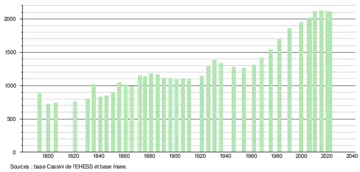 L'évolution du nombre d'habitants est connue à travers les recensements de la population effectués dans la commune depuis 1793. Pour les communes de moins de 10 000 habitants, une enquête de recensement portant sur toute la population est réalisée tous les cinq ans, les populations de référence des années intermédiaires étant quant à elles estimées par interpolation ou extrapolation[24]. Pour la commune, le premier recensement exhaustif entrant dans le cadre du nouveau dispositif a été réalisé en 2005[25].