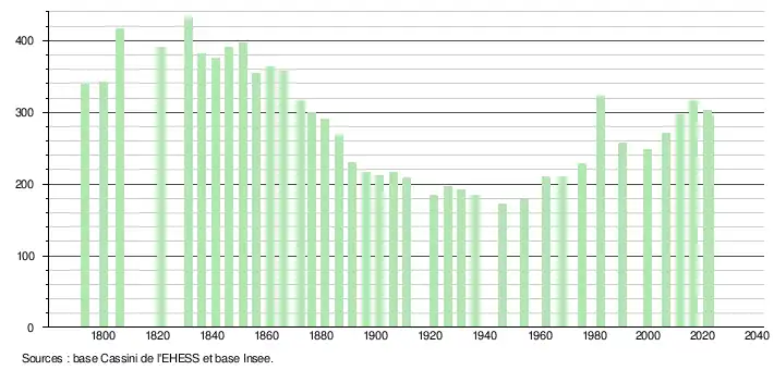 L'évolution du nombre d'habitants est connue à travers les recensements de la population effectués dans la commune depuis 1793. Pour les communes de moins de 10 000 habitants, une enquête de recensement portant sur toute la population est réalisée tous les cinq ans, les populations de référence des années intermédiaires étant quant à elles estimées par interpolation ou extrapolation[14]. Pour la commune, le premier recensement exhaustif entrant dans le cadre du nouveau dispositif a été réalisé en 2006[15].