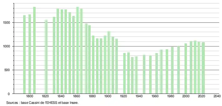 L'évolution du nombre d'habitants est connue à travers les recensements de la population effectués dans la commune depuis 1793. Pour les communes de moins de 10000habitants, une enquête de recensement portant sur toute la population est réalisée tous les cinqans, les populations de référence des années intermédiaires étant quant à elles estimées par interpolation ou extrapolation[27]. Pour la commune, le premier recensement exhaustif entrant dans le cadre du nouveau dispositif a été réalisé en 2006[28].