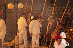 « L’agneau pascal était abattu en trois groupes […] Lorsque le premier groupe entrait et que la cour du Temple était remplie, on fermait les portes du Temple. Une tekia (longue sonnerie), une teroua (sonnerie saccadée) et une tekia étaient sonnées par le chofar. Les prêtres se tenaient en rang, avec des bassines d’argent et des bassines d’or en main […] Un Israélite abattait son offrande et les prêtres recueillaient le sang. Le prêtre passait la bassine à son collègue et son collègue à son collègue, chacun recevant une bassine pleine et rendant une bassine vide. Le prêtre le plus proche de l’autel jetait le sang à la base de l’autel. Pendant la réalisation de ce rituel, les Lévites chantaient le Hallel[28] »