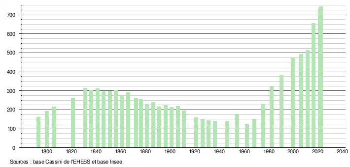 L'évolution du nombre d'habitants est connue à travers les recensements de la population effectués dans la commune depuis 1793. Pour les communes de moins de 10 000 habitants, une enquête de recensement portant sur toute la population est réalisée tous les cinq ans, les populations de référence des années intermédiaires étant quant à elles estimées par interpolation ou extrapolation[29]. Pour la commune, le premier recensement exhaustif entrant dans le cadre du nouveau dispositif a été réalisé en 2006[30].